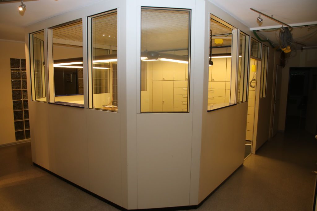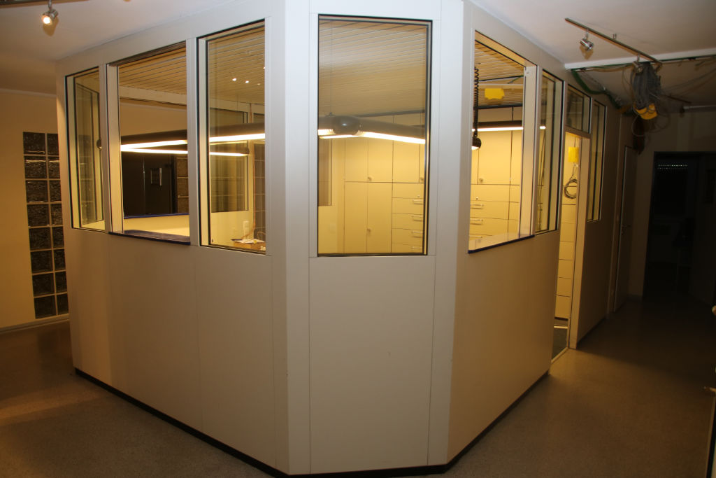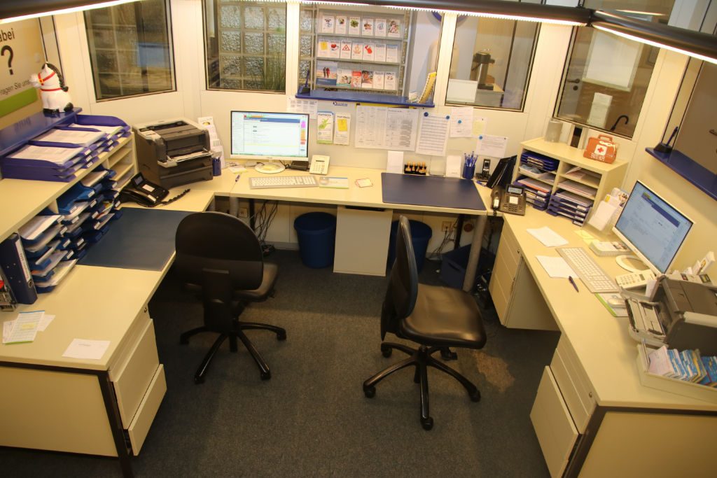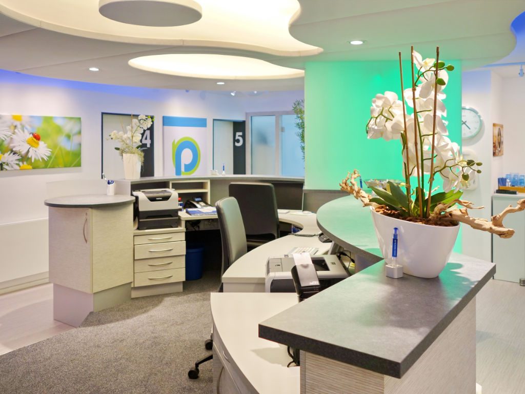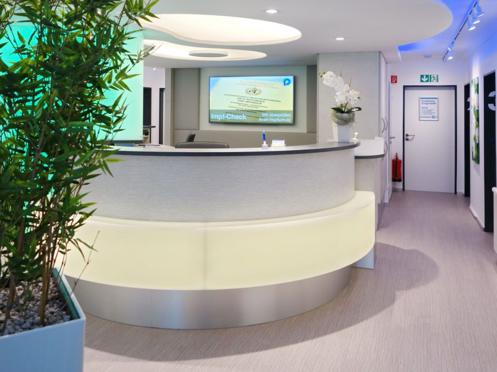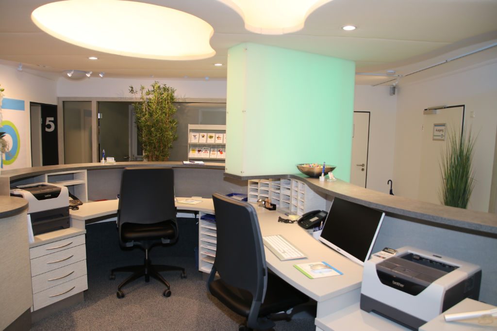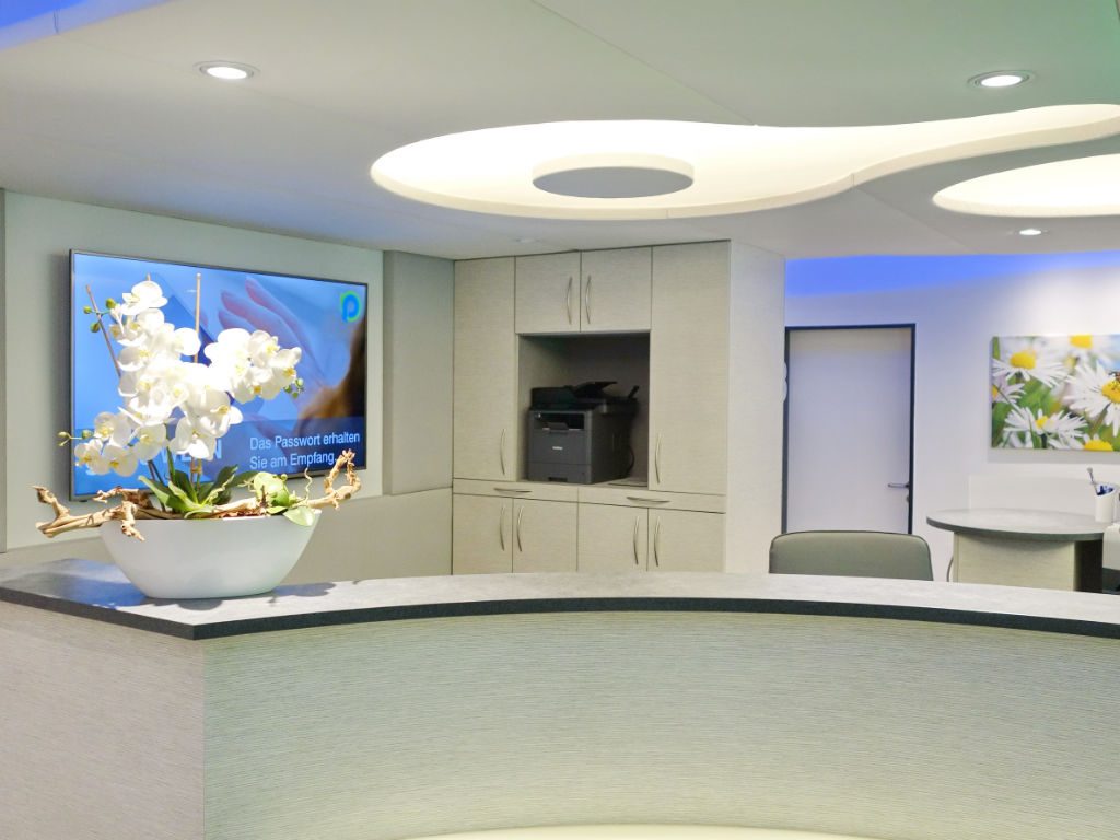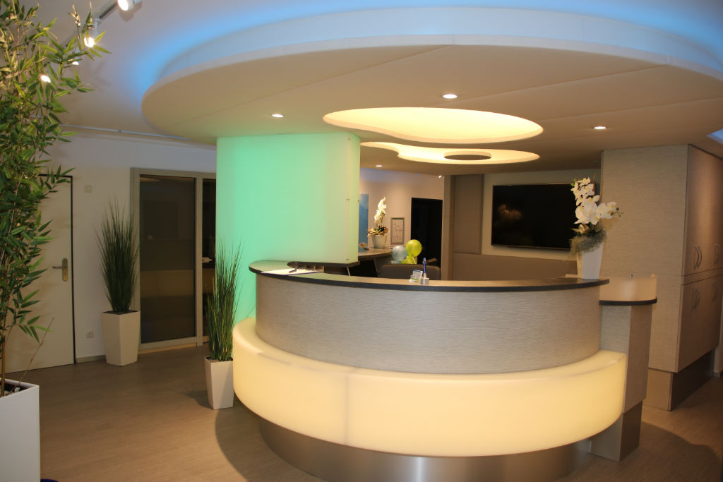 Umbau des Empfangsbereichs der Arztpraxis Dr. Fröhlich. Neue Thekenanlage, Decke, Boden und Wände.